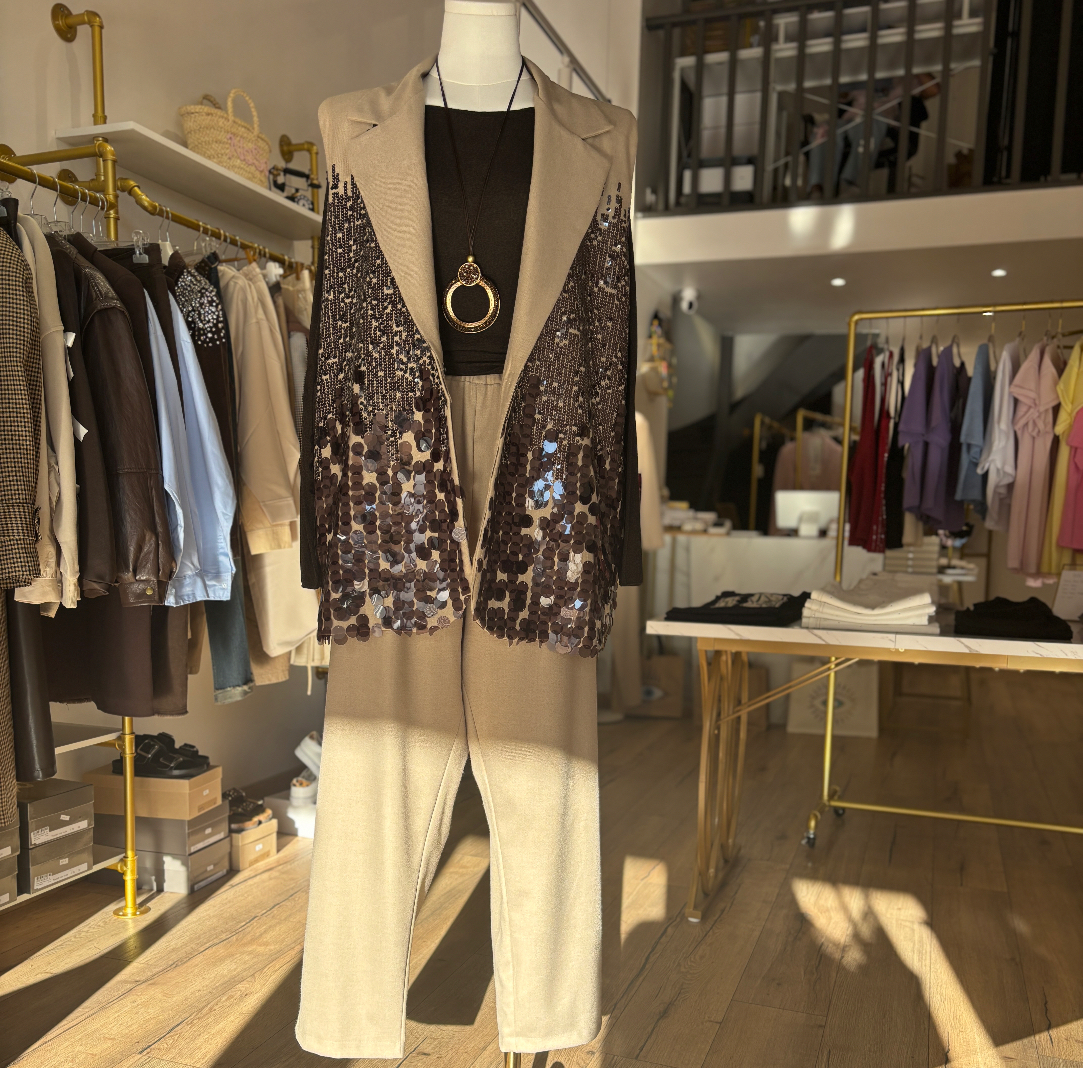 👚 Une veste beige à coupe fluide, sublimée par des sequins scintillants sur le devant pour un effet glamour sans effort.