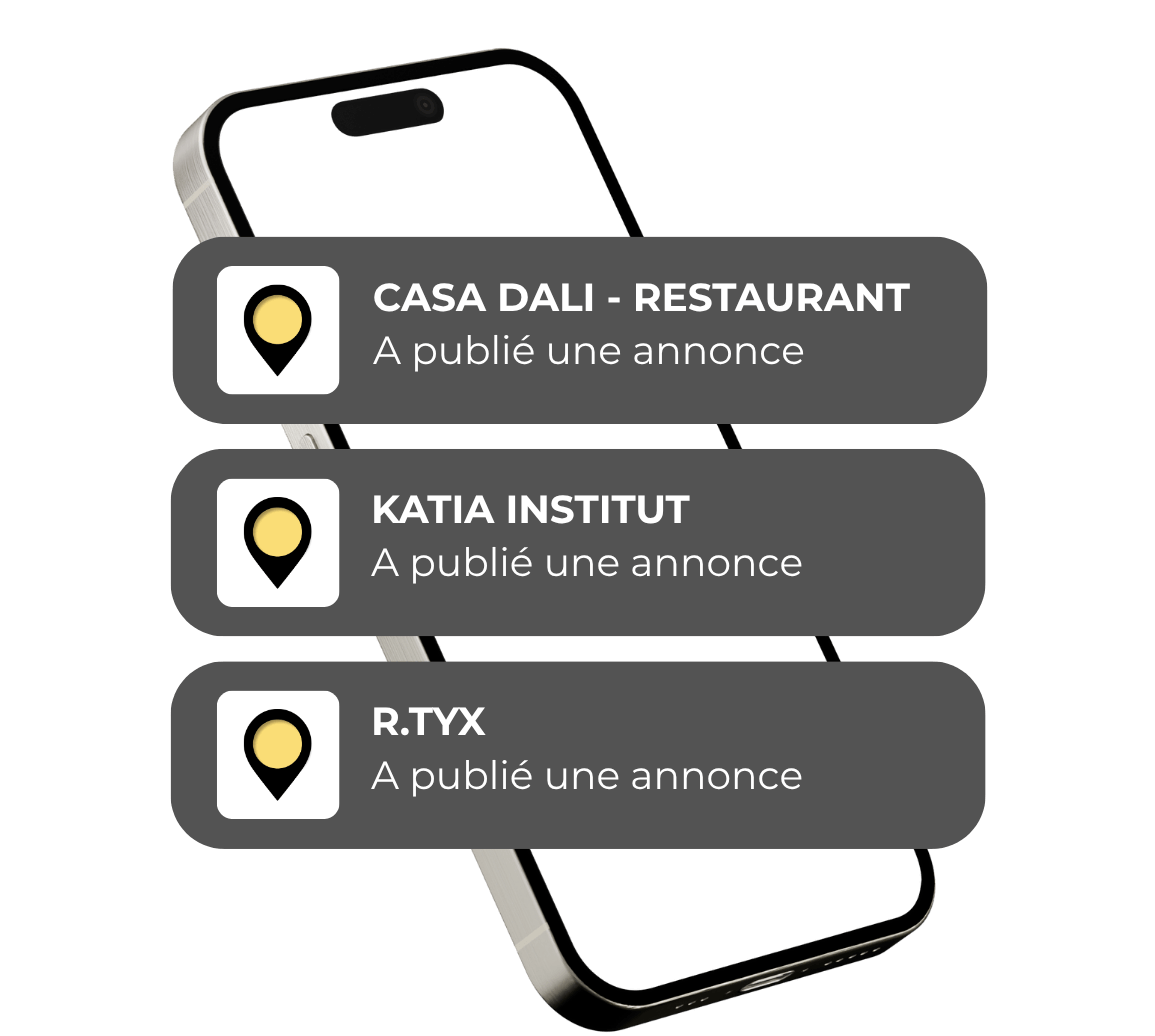 Chaque annonce envoie une notification directe à vos clients et est visible par les utilisateurs proches de vous dans l’accueil. Impossible de passer à côté.
